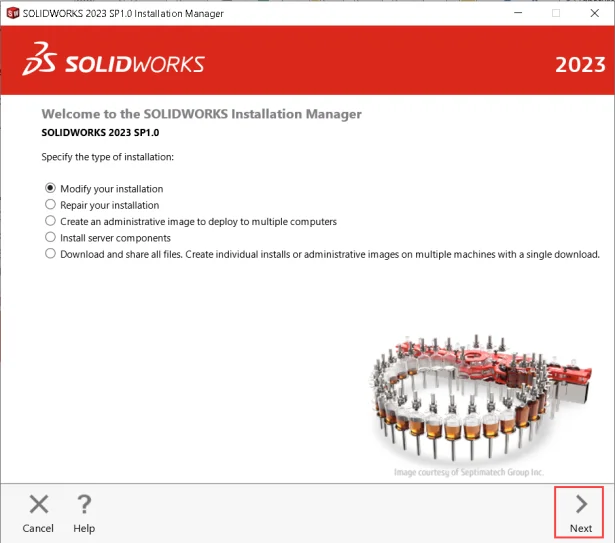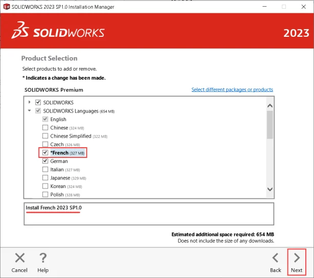 and select Change. - In the SOLIDWORKS® Installation Manager, click ‘Next’ until the Product Selection screen appears.