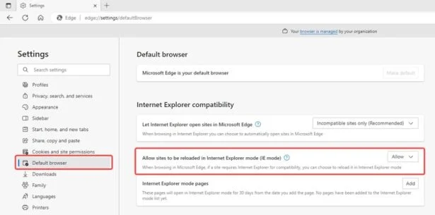 - In the “Default Browser” settings, Set the option “Allow sites to be reloaded in Internet Explorer (IE mode)”