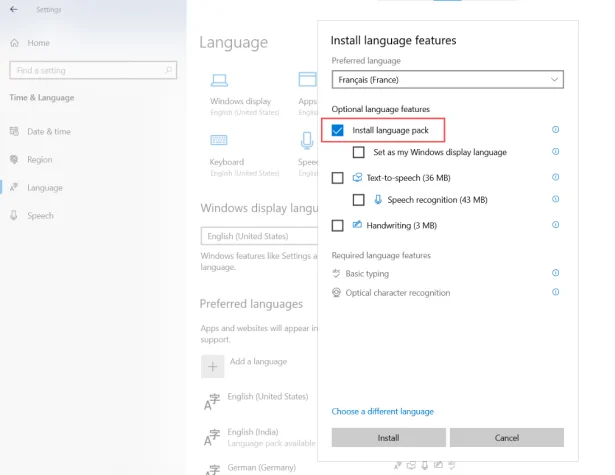 Ensure that the windows consists of same language pack or not from Start Button > Settings > Time & Language > Language > under Preferred language, check whether the language pack is downloaded or not. If not then refer below steps to download the same.