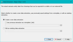 Data Extraction can be initiated by typing command EXTRACTDATA or simply DX in DraftSight® command window. This will open a wizard with options to create a new data extraction or we can use existing data extraction too.