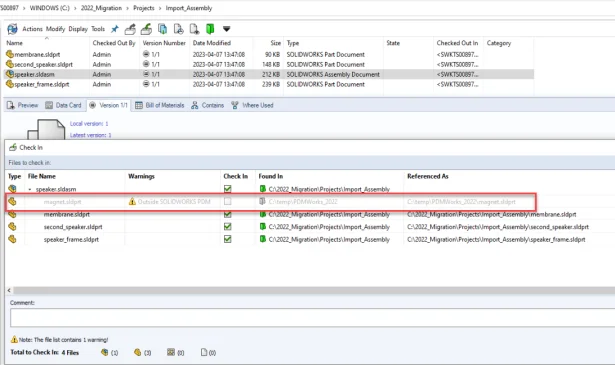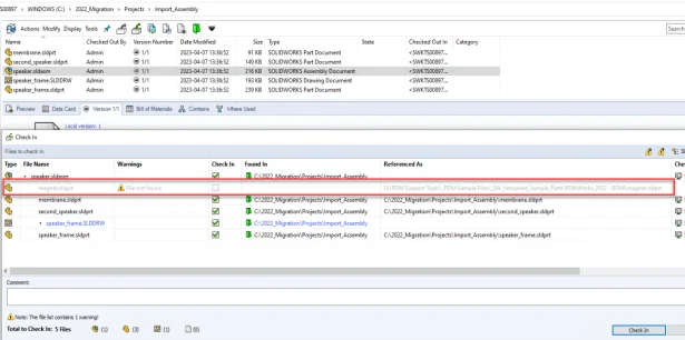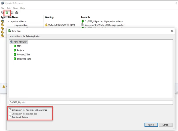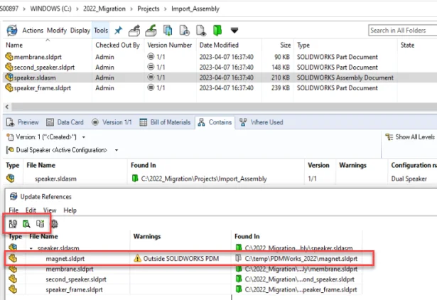 Using Only search for files listed with warnings is a good method to search and replace files references with warnings. Here the magnet.sldprt is found in another PDM folder and the speaker.sldasm references are easy to update