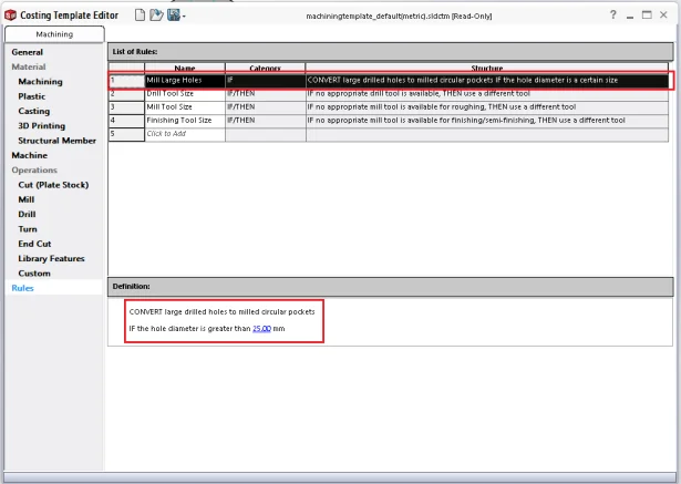 In a Costing Template, a rule can be established that identifies any hole with a diameter exceeding a user-defined value as a circular pocket. Such holes will be machined using a milling operation rather than a drilling operation. Since the user determines this value, it can be adjusted to meet specific requirements.