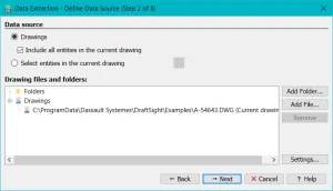 The step 2 of Data Extraction wizard is called “Data source” where we can select if we want to extract data from all the drawings, or only a specific part. Since we want to extract information of every block of the drawing, choose the first option as shown above and click Next >.