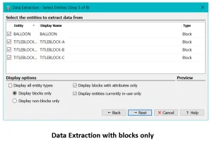 Data Extraction Wizard is mostly used to create a table from blocks that contain attribute data for bills of materials and option ‘Display blocks with attributes only’ is obviously a best option for that. However, the wizard can be used for any kind of DraftSight® data (including geometry, hatch etc.).