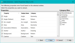 In step 4, we can select the properties and categories that we want DraftSight® to use when extracting data from a file. e.g. if we select ‘Text category, all the properties related to ‘Text’ will be extracted.