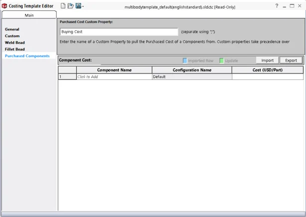 In such scenarios user can define a custom property name in the ‘Purchased Components’ section of multibody Costing template (.sldctc), for example ‘Buying Cost’ (See the image shown below for reference.).