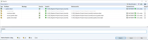During initial check-in, SOLIDWORKS® assemblies and drawings are scanned to display file references in the Check In dialog. If a file reference is not found in the last saved path or by the search routine, there is a File not found warning. The Found In column is empty and the Referenced As column lists the last saved path.