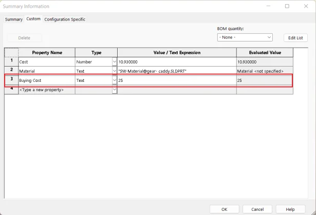 Now add ‘Buying Cost’ and its value to the Custom Property for all the parts having purchased cost(See the image shown below for reference.).