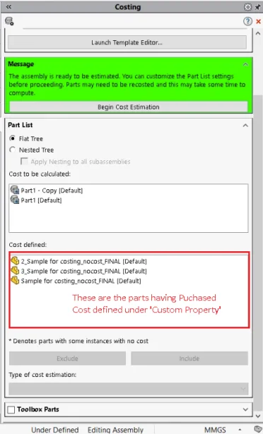 Yes, for all the parts which has purchased cost defined in its ‘Custom Property’, the purchased cost is automatically calculated before you ‘Begin Cost Estimation’ in assembly. User just need to make sure that no cost calculation is done at the part level individually. See the image shown below for reference.