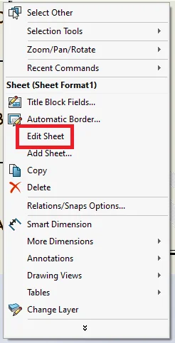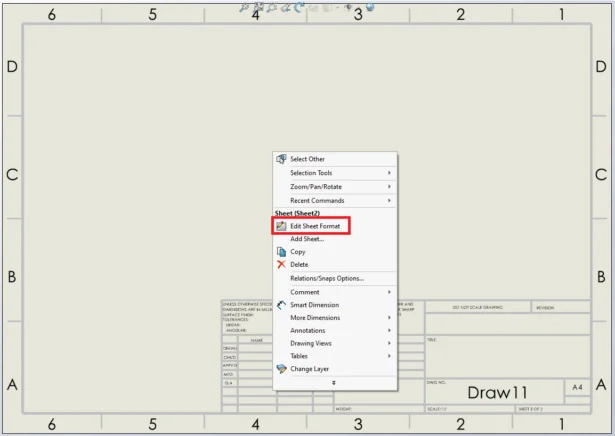 To add an Object as a watermark on the sheet, start by creating a new drawing with required sheet size and format. Right click on the blank area of the sheet > Edit Sheet Format.