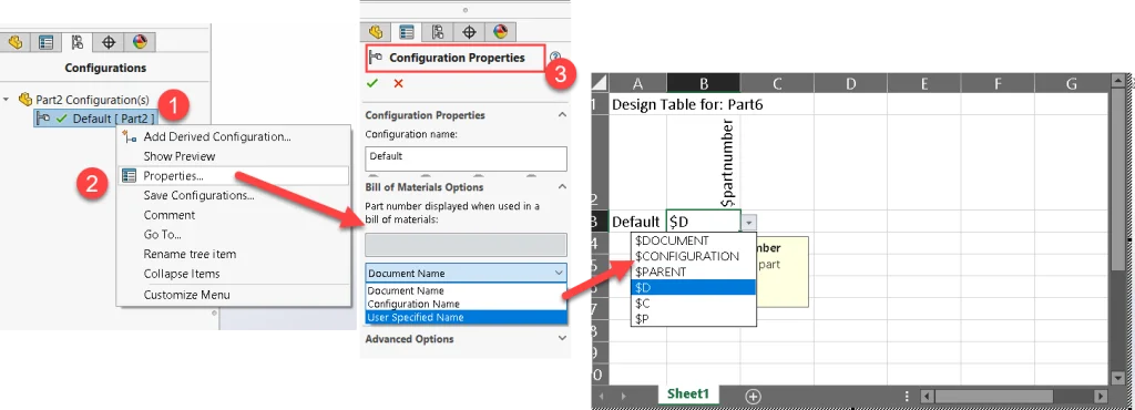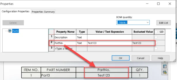 2). Another option is to add a configuration-specific property, such as ‘PartNo,’ for the Physical Product. This involves adding a column for this configuration-specific property in the Design table ($PRP@PartNo) and then including a ‘PartNo’ column in the BOM table in the drawing.