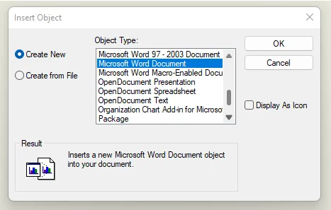 Then go to Insert > Object > Create new. The ‘Object Type’ section shows various objects that you can insert onto the drawing sheet. Scroll down in the list > Select ‘Microsoft Word Document’ > OK.