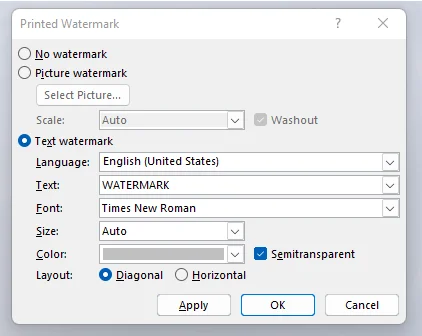 This replaces SOLIDWORKS Command Manager with the commands of Microsoft Word. Go to Design tab > Watermark > Custom Watermark > text Watermark. In Printed Watermark window, set required Text, Font, Size, Color for the Watermark text.