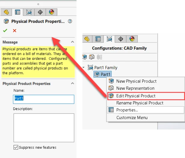1). Setting Physical Product (Configurations: CAD Family) Name: By aligning the Physical product name with the desired part number, users can ensure consistency across their designs.