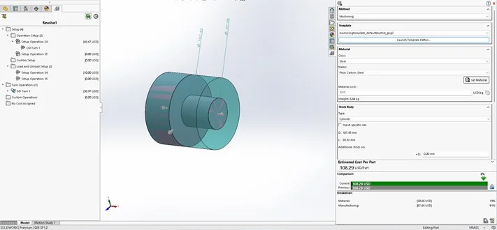The two major components are ‘Manufacturing’ and ‘Material’ cost. The SOLIDWORKS Costing tool has determined the manufacturing cost to be 87.64 USD and the material cost to be 20.66 USD, as depicted in the image below.