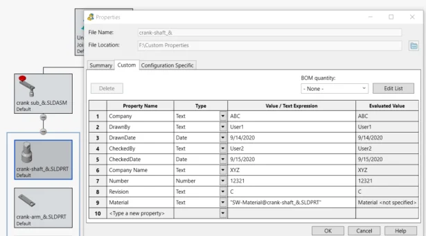 In Treehouse, you can set up your assembly hierarchy in a graphical user interface before you build your models in the SOLIDWORKS software. You can add to an existing file structure in Treehouse. But do you know, you can add/edit custom properties to a Treehouse node. This functionality is identical to the functionality available in the SOLIDWORKS software. Custom properties can be add/edit to the part without having to open in SOLIDWORKS. Simply double click the part or by selecting the ‘Show Document Properties’ icon and this will open the properties tab.
