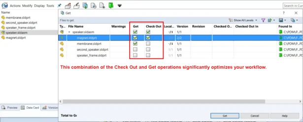 With PDM 2025, these processes have been integrated. Now, when you select either a part or assembly file, a dialog box enables you to check out and retrieve the version at the same time.