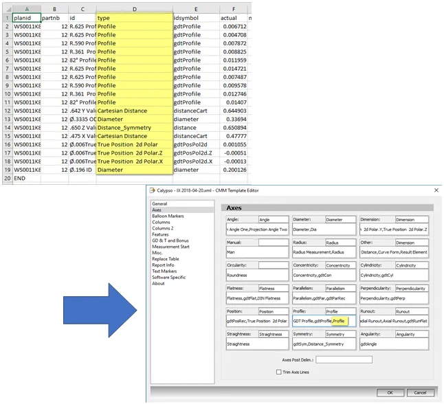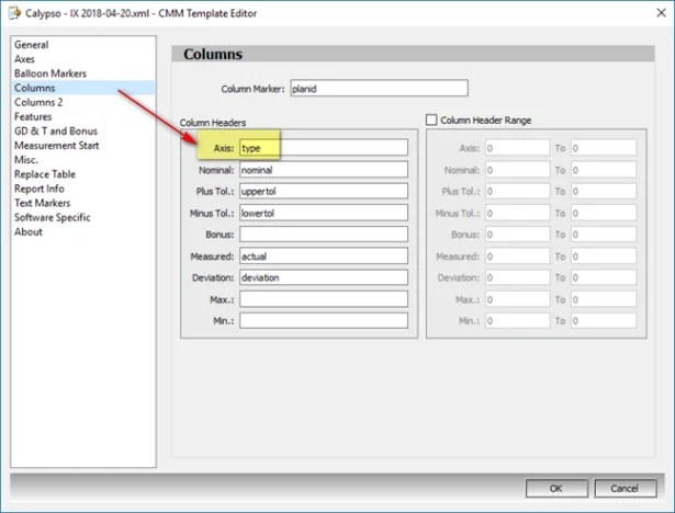 - Axis Name Variability: Similarly, For some CMM software, the programmer has control over what the axes are called, which can vary between different setups. If axis names are missing or mismatched in the data file compared to your template, it can lead to incomplete or inaccurate data imports. The template has to match the information in the CMM Data File. Example: