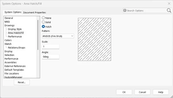 - From Tools > Options > System Options > Drawings > Area Hatch/Fill.