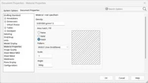 Later you can edit the hatch pattern from the PropertyManager by selecting it.When you define any specific material from the existing one available in material library in part model, then the hatch pattern options under ‘Tools > Options > Document Properties > Material Properties’ will be greyed out. It will display the details of the hatch pattern of that material applied, which are not editable.