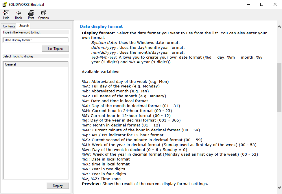 Lucky for us, within the SOLIDWORKS Electrical Help Documentation, there is a large list of variables we can choose from to create our own unique date format. Below is a screenshot of the variables we have available to us.