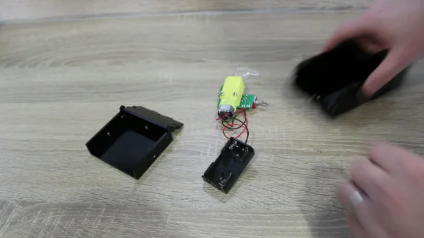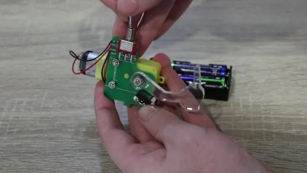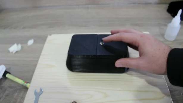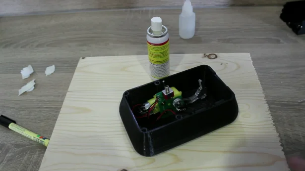 For assembly, we disassembled the old useless box, then put the battery box and PCB in place. We then glued the static lid in place and clipped on the moving lid. The hinge was a little stiff, so it was trimmed with a scalpel and used a lubricant to loosen it up. This made the hand press the switch and the lid went down went with it.