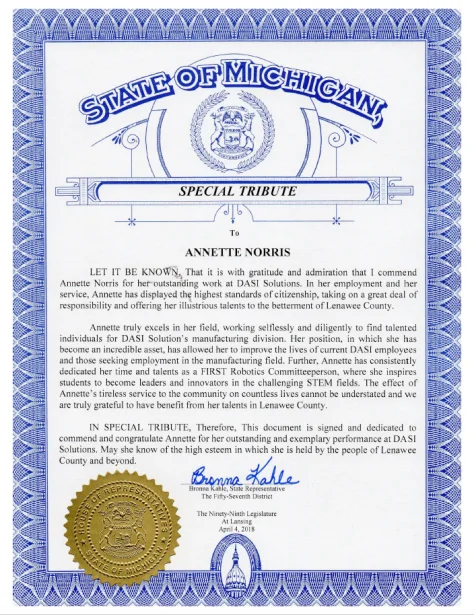 Throughout her career, Norris has received awards recognizing her contributions to manufacturing and education. Recent recognitions include the U.S. Department of Labor’s Office of Apprenticeship Creative Innovators and Trailblazers Award in 2012 and the Manufacturing Institute’s Women in Manufacturing STEP Ahead Award in 2013. She also received a Special Tribute from the State of Michigan on April 4, 2018, “for her outstanding work at DASI Solutions.”
