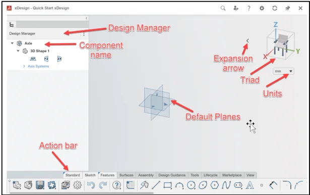 The Action bar contains design tools are similar to the SOLIDWORKS CommandManager with various default tabs.
