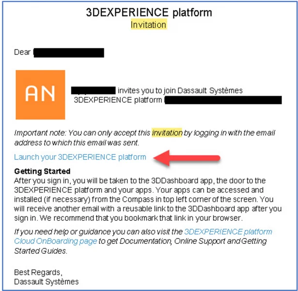 You will receive the 3DEXPERIENCE platform Invitation link via email. The email you use must be the same as your 3DEXPERIENCE ID.