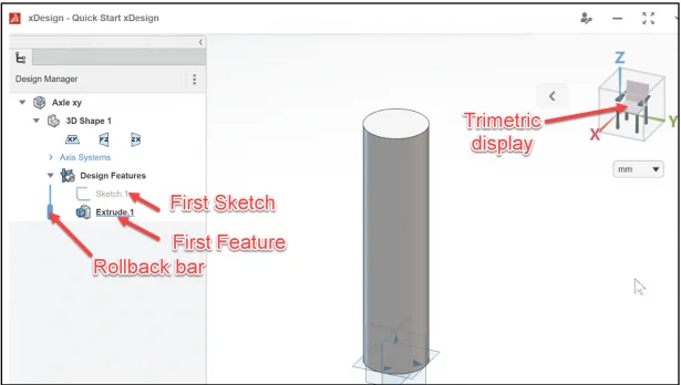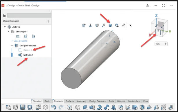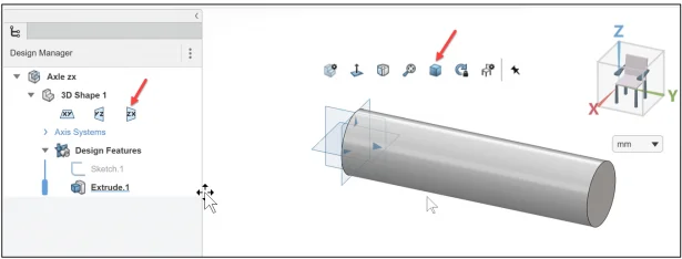 The Design Manager display is similar to the SOLIDWORKS FeatureManager. They both provide information about the Physical Product (Axle xy). The 3D Shape 1 contains geometry, sketches, and features.