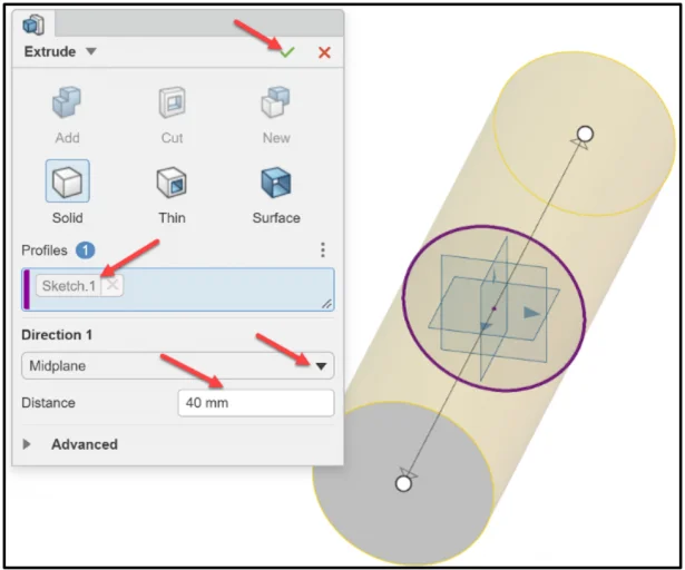 Select Midplane from the drop-down menu for Direction 1. The feature is centered about the yz plane.