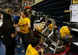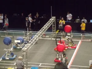 The team spent part of the practice day on Thursday getting things fixed up and the robot through inspection.  Some years that would take the whole day, but this year the robot and drive team got out and ran some practice matches in the afternoon.  Friday morning there were a few loose electrical connections that fortunately didn’t cost the team any matches.  We had some great match play with only a few glitches that were fixed as soon as they showed up.  We won all six of the Friday matches.