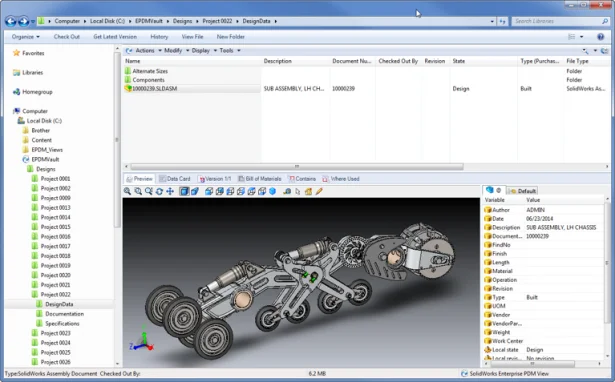 SOLIDWORKS Enterprise PDM helps you avoid file sharing conflicts through a simple check-out, check-in process. Everyone on the team can see who is working on a file at any time. Enterprise PDM automatically manages file references for SOLIDWORKS files along with several other native CAD formats. If a user renames or moves a file, all of the associated drawings and assemblies are automatically updated and the change is stored in the file history. References don’t get damaged and you can always tell who made the change. Enterprise PDM also keeps a full file version history. You can never overwrite your work. Previous versions can be retrieved to understand as-built configurations or to check for re-use in new designs.