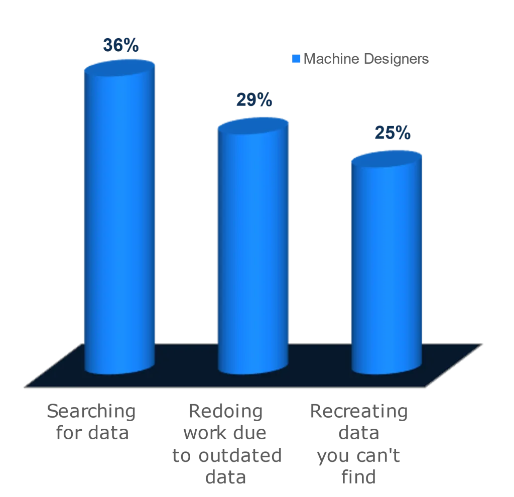Many engineers find the inability to quickly find the data they need lessens their ability to innovate. The figure below shows the percentage of data management-related activities that steal significant time away from the innovation work of machine designers.