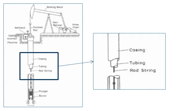 Inside the tubing we have the sucker rod, which is used to activate the pump in the bottom of the oil well. A regular oil well is between 1500 m to 5000 m, depending upon the exploration region. There are many connections in one single string, therefore, if only one of these connections fail, the whole oil well stops producing.