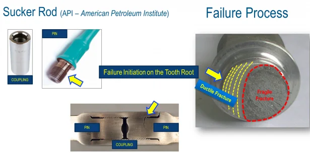 The figure below shows a sucker rod connection that failed in the last engaged root thread. The picture on the left shows the failure point, while the picture on the right shows the failure process starting with a ductile failure until the whole section collapses showing a fragile fracture. The picture at the bottom shows a complete connection and an initiated fracture on the pin component.
