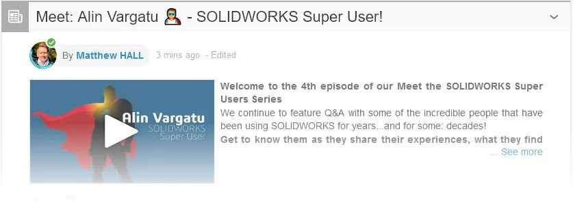 Alin goes into wonderful detail about how with his SOLIDWORKS super powers, he is able to enter an alternate universe, use intuitive tools that have mind reading-like powers built in to them. He also tells us how he engages in the SOLIDWORKS User Forum community to connect with other people all around the world and help them succeed with their SOLIDWORKS challenges. Truly a super friend for any and all using SOLIDWORKS who may just need a little bit of help.