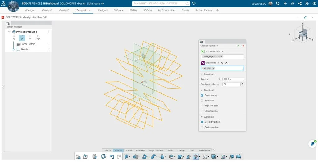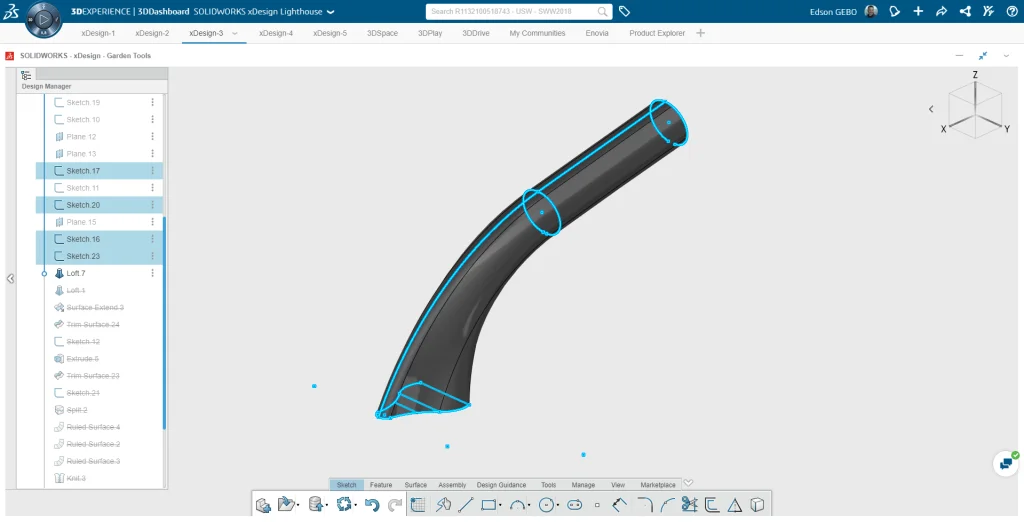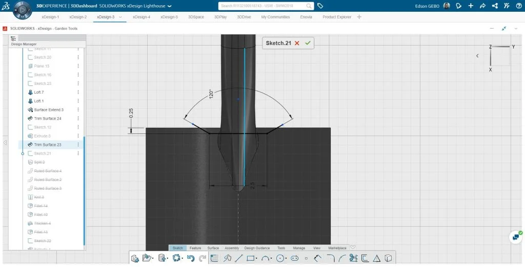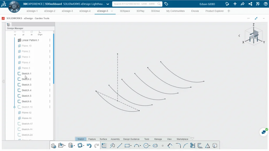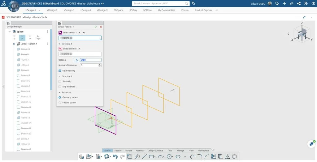 The first step is to have a game plan. E.g. creation of sketches, planes, etc. Is the blade created first or does the collar come first? I went with creating the blade first is probably the best approach with the step being last, but fear not nimble cad guru! You can rearrange sketches and features to your liking in xDesign just as easily as you can as in SOLIDWORKS. Let’s begin… Did you know you can create a Linear Pattern of planes? I mention this tip in my technical blog post from last month, along with other valuable tips & tricks. Select the Linear Pattern tool, pick the plane you want to pattern from the Design Manager tree, then the direction, select your spacing distance, how many instances, click the green check and that’s it! You can also create a Circular Pattern of planes too. These planes will me used for the sketches that create the loft in the next step.