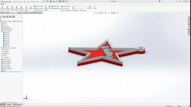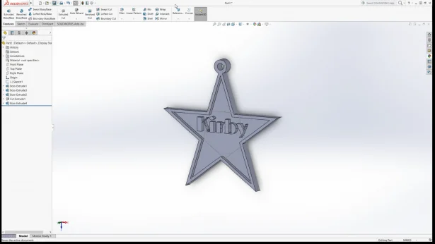 So, to start of we made a star using basic SOLIDWORKS features, we then made a neat border and put the name Kirby in the face. We made sure there was a loop on the top to make it a keyring. The name part is the section that we are going to customize. Essentially, all you do is change the name or replace it with a logo.