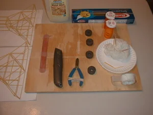Starting from the top left of the board you will see the glue that I am using. I’m diluting it to 50% of its consistency so it runs into the tiny spaces of the noodle joints. This works out good but not perfect. If you are not careful it will run onto the paper printout that is used for a template to build upon. Then comes the box of spaghetti. Keep in mind that this is a very thin type of pasta and it can be considered to be an extra level of difficulty. This could be good practice for surgeons. Next we come to the two pill containers. Great news here. The glue does not make a mess inside of it by coating the inside. For some reason the glue due to cohesion drains back nicely even after a rough shaking of the contents to keep it mixed well with the water. The second bottle contains those small leftover pieces that can be used somewhere I’m sure. “Waste not want not.” The round black magnets add weight to hold down parts that are springy. Anything similar would work. They also are easily added to for more weight in an area and don’t slip off of each other. The only problem I had with them is that you have to get the polarities right or you will push the one off that is there already and cause a compound fracture of a part. Luckily the parts are cheap and easily procured. The tape is used to hold parts down to the paper template so you can get things glued together following the pattern you made. Since this building material is very light in Mass, it doesn’t take much for it to move when bringing other parts ready for gluing into the assembly. Afterwards you could use the tooth picks to pull up the tape so you can get an edge to pull it back off of the part. Toothpicks used for the project are the preferred gluing choice so far. Small droplets that do not fall off from the tip when you are holding it up vertical seem to be the ideal amount of glue. In the paper plate are my wet paper towels to clean the fingers of glue. Another alternative method for gluing could be a very good eye dropper with a small tip for more precision in placing of the glue. I would have reported on this possible method but I cannot find my wife’s eye droppers. I think she is starting to hide things on me. Could be? The wet paper towels of course keep the toothpick points clean from any residue of glue. Keeping the fingers cleaned of glue is very important in this project because these pieces are like magnets to anything that will glue them together including fingers and nervous perspiration. I found one small piece on my eyeglasses after I adjusted them. I looked for quite awhile and never found it until I took a break. You get the idea. I tried a scissor to cut the spaghetti and although it did work okay it was awkward to use a normal pair to do this with. A small pair of toenail clippers works very well for this project using Linguine. Another problem I found with the cutting of the spaghetti is that the piece you cut usually goes flying across the floor if you don’t stop it by using the wet paper towels or a small box to act like a backstop. I tried a shear cut method using the box cutter but it creates more of a problem then it solved and is too dangerous to use in classrooms. I’ve had to keep students in mind at all times during this creation and it is all about them anyway. Now we move over clockwise to the emery board used by women mostly to do their fingernails. By the way, fingernails can be very useful tools in doing this by adding to the picking up ability of these parts from a flat surface area. Girls might have a decided advantage with them. I keep mine short so I can type which works out fine for me, but not so good for this act. Oh yes, the emery board is used to sand down a part that might be a millimeter or so too big or have a jagged edge. Just rubbing it on the medium rough surface can quickly shorten the part. No biting off the extra is allowed. This emery board was donated by my Umbrella Cockatoo who does not like it at all and she doesn’t even want it back. It also pays to have a very smooth flat surface to work on. Any deformation of the surface (my plywood work surface has a small curve in the side that I am working with) can be detrimental to producing continuity of parts that are meant to be alike in symmetry. I don’t think I missed anything but you know how to get in touch with me to ask me if I did. One last point. Enjoyable music playing in the background lends a more pleasurable assembly of these parts. Angel hair spaghetti is even smaller in diameter than the linguine. I would not advise it unless your mental health insurance is paid up. I purposely picked this size figuring that larger sizes would be even easier. I know I am right about that without even using something bigger like Fettuccini. Bigger is easier but smaller is more impressive. Here are a couple of more pictures down below.