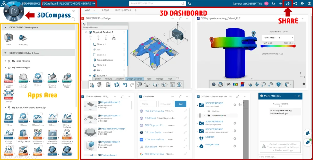 The 3DCompass is the circle of life with four quadrants each providing access to different types of Apps. The Apps area contains all the available products and services. The 3D Dashboard is where you can simply drag and drop different Apps to create your customized experience!