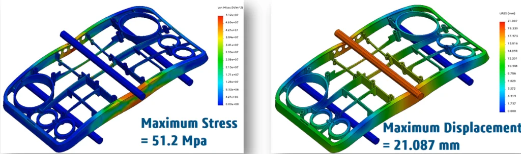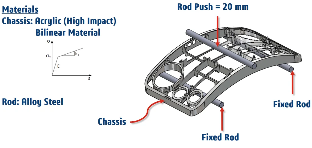 The chassis frame model below is subjected to a three-point bending test in SOLIDWORKS Simulation Desktop using nonlinear analysis. This testing method is common in engineering applications to determine the flexural strength of the product. The concave side sits on two-cylinder rod supports and the convex side is pushed down through a third rod as shown. Material, Geometry and Contact nonlinearities are accounted to simulate this complex physics and account for a realistic behavior. The chassis material is Acrylic High Impact and it is assumed to be a bilinear material. This means that beyond the yield stress point, σY, the plastic region is modeled using a linear slope ET. The Elastic region is modeled using the young’s modulus or E.
