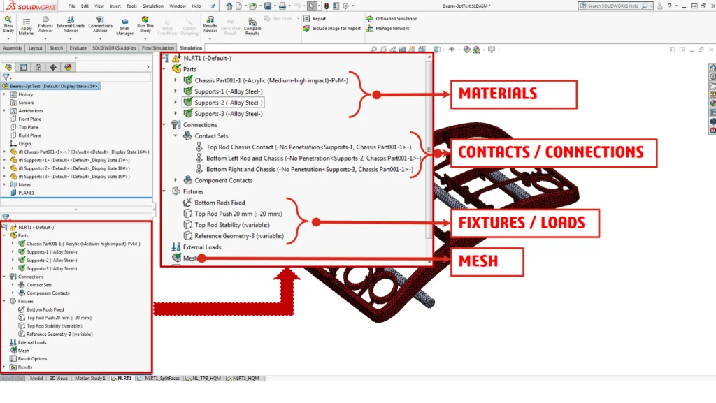 SOLIDWORKS Simulation is easy and intuitive with the best user interface (UI) in the industry. Below is a snapshot of the setup. For this base analysis, lower order tetrahedral elements were used for a quick first pass results.