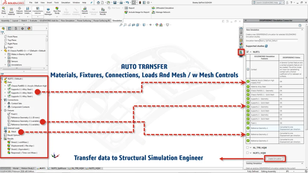 Upon checking the add in, the program smartly detects any linear static or nonlinear static setup in SOLIDWORKS Simulation and displays them in the task pane area as shown below. It then displays what items from the SOLIDWORKS Simulation setup are supported that will be transferred automatically to Structural Professional Engineer. Pretty much every detail from materials, fixtures, connections, loads and mesh are mapped automatically.