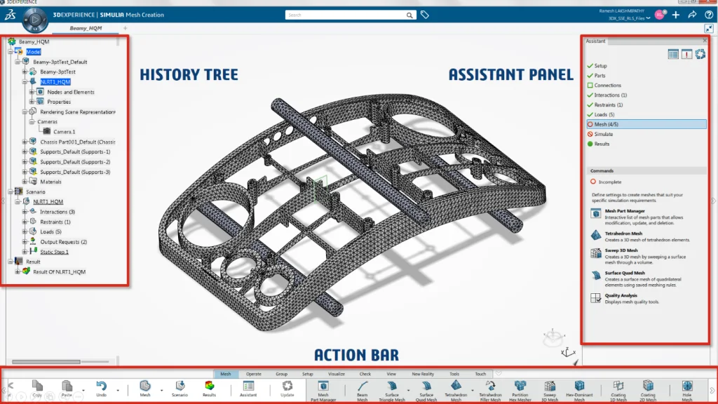 1. History Tree – Visual tree of all the components, such as geometry, loads and boundary conditions, mesh, results 2. Action Bar – Access all the features and commands 3. Assistant Panel – This is probably the easiest way to interact with the simulation data. The Assistant panel is similar to the Simulation advisor in SOLIDWORKS Simulation, in that it provides the steps that guides you through every required component of the simulation. The Assistant panel is a great way to quickly familiarize with the user interface.
