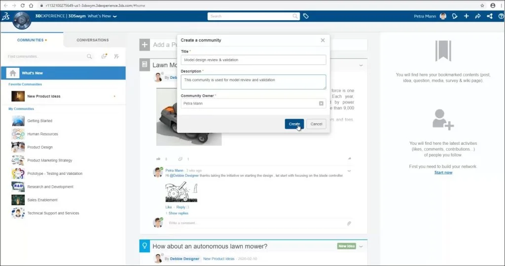 Create New Community and Add Members Create a new community with the 3DSwym app and give it a name such as Model Design Review & Validation community. Invite co-workers (“Members”) to join your community. Because you are working from the cloud, all information is shared in real-time. Send a message (“Post”) to your community and give them a heads up regarding the model review project.