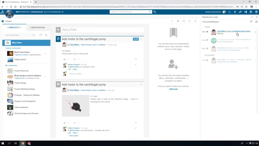 3DSwym is where everyone comes together as a team on one common platform to share information in real-time. You can make posts, discuss projects, create tasks, ask questions, and more.