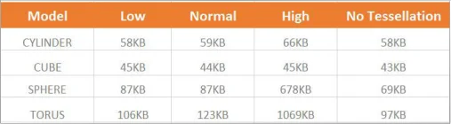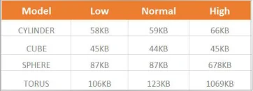 We noticed that more curved shapes, such as the torus or sphere, there was a significant impact on file size (20-30KB). This is due to the number of triangles required to create the surfaces. The cube requires 12 triangles (2 per face), regardless of the image quality.
