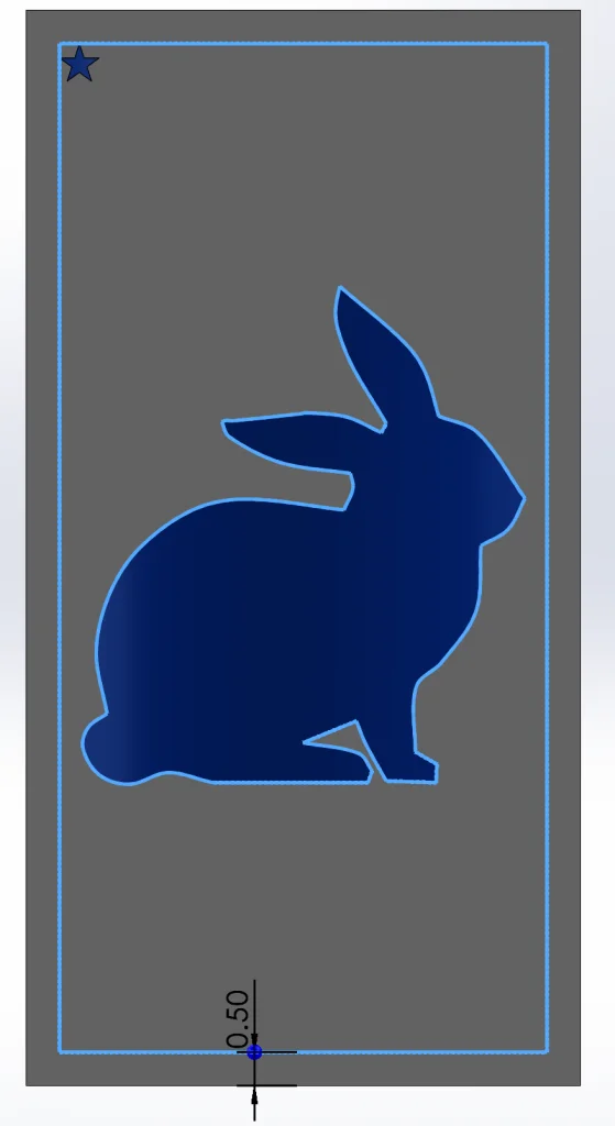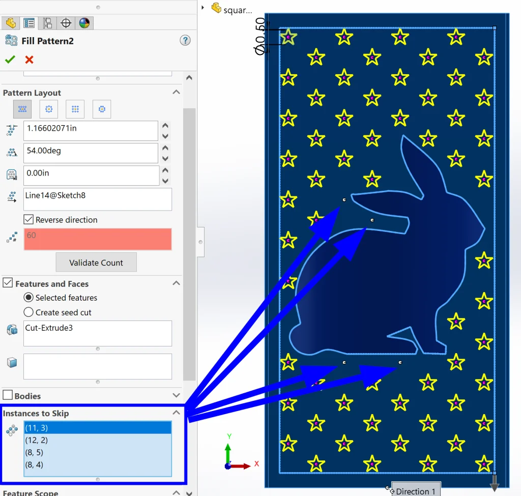 Fill Pattern allows us to select the Pattern Layout as well as the spacing within that pattern. I played with these parameters until the preview looked almost perfect. Then I specified a few stars that I wanted to leave out under Instances to Skip. These stars would have over-crowded the bunny, so I’m glad I had the option to quickly remove them. Note: another option would have been to offset the bunny design in the boundary sketch so that none of the stars would have gotten quite as close to begin with, but in this case this was a great option as well.