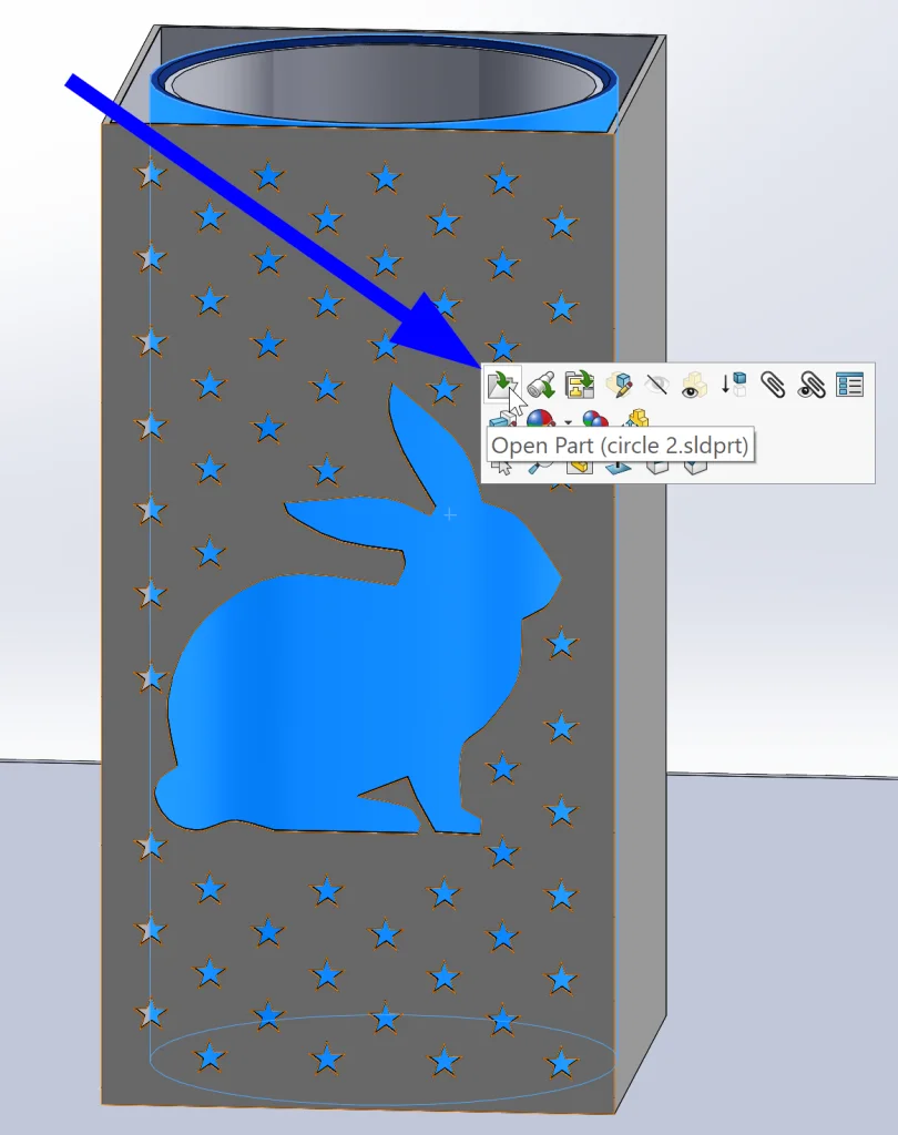 At this point, I also decided to go back and add some flair to the inner cylinder. Luckily, this is sinch – all we need to do is simply click on the part we want to edit and select to open it from the in-context toolbar that pops up.